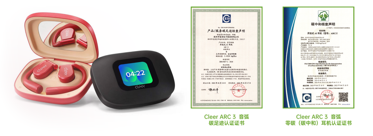冠旭电子在低碳发展上并不局限于制造端,还将可持续理念延伸至品牌全链路运营。旗下自主品牌Cleer自2012年创立以来,便将低碳理念植入品牌基因,构建起从材料选择、生产制造到包装运输的 “绿色闭环”。2024 年,Cleer 推出全球首款由零碳工厂智造的开放式零碳耳机 ——Cleer ARC 3 音弧 开放式AI耳机,该产品以 “碳中和” 为核心设计目标,采用可回收材料与绿色能源生产工艺,全生命周期碳排放为 0,并通过赛西、沙利文等权威机构认证,成为行业内首批“零碳耳机”认证产品。