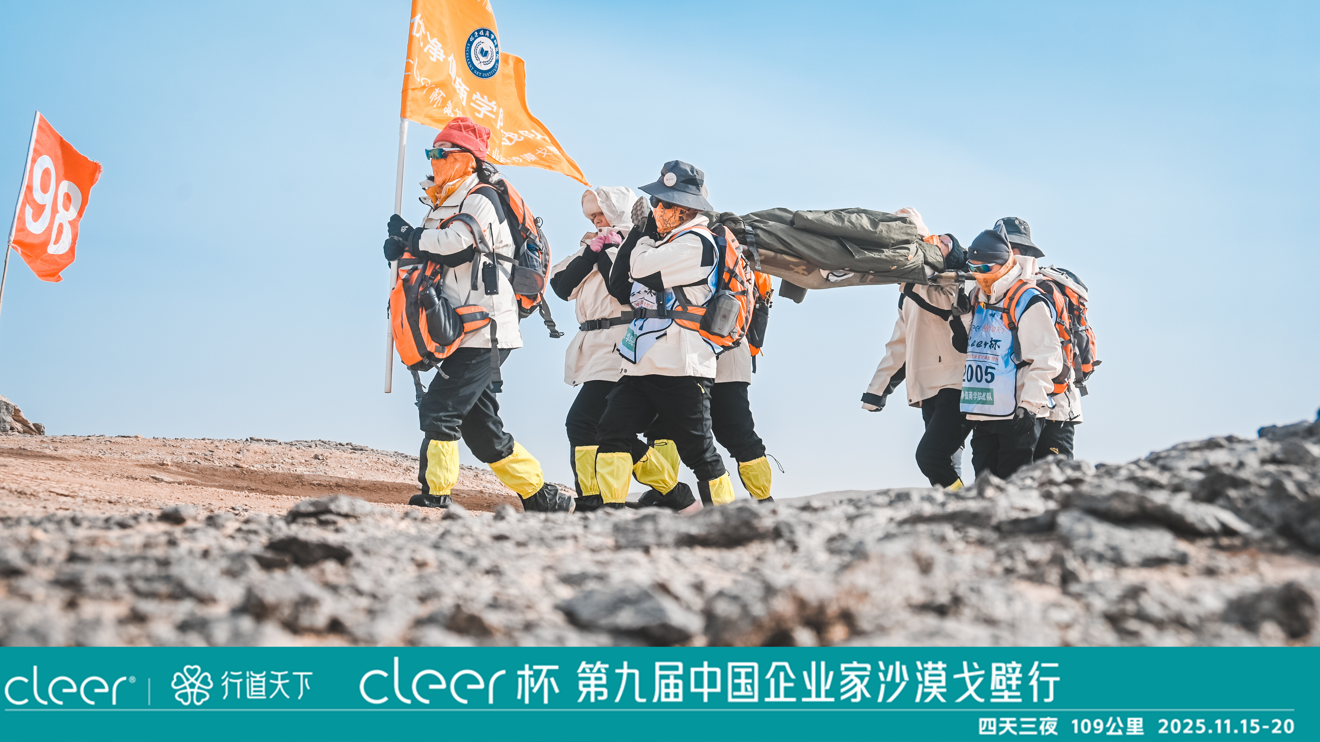 本届戈壁行以“放下—开悟—使命—重生”四大主题贯穿全程,109 公里的徒步让精神的递进自然发生。从起点开始,队员们在轻负重的行走中逐渐放下日常的喧嚣与压力,让心态回归最纯粹的状态;随着地貌在沙漠、丘陵、峡谷之间不断变化,每个人在日复一日的沉默前行中与自己对话,思考企业、行业与人生的方向;当团队任务出现——战队协作、蒙眼行走、紧急救援模拟——使命感不再停留在表达,而是通过互助和信任,在真实的挑战中被重新点燃;而抵达终点的那一刻,所有人在历经疲惫与感动后,获得了属于自己的“重生”,这份力量将指引着他们走向下一程征途。四天的行走不仅是身体的跨越,更是精神的升维。