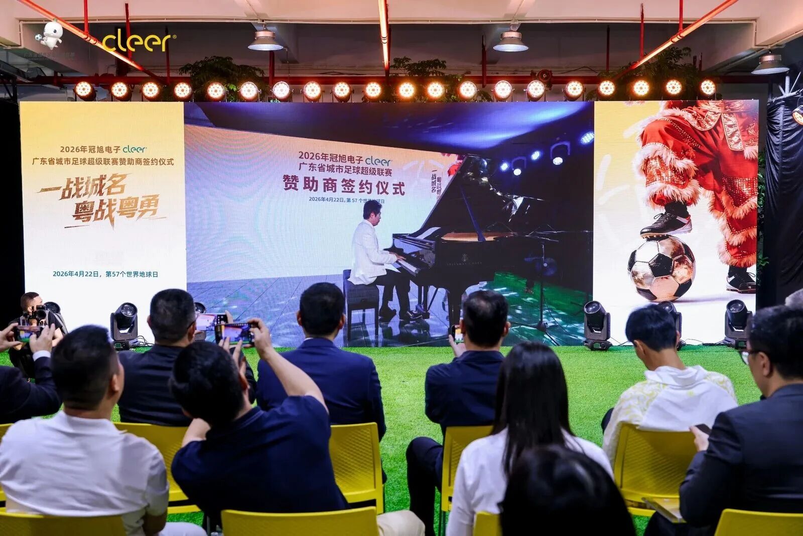签约仪式活动现场,作为联赛总冠名赞助商,冠旭电子(Cleer)更携手Cleer大师音质全球代言人国际钢琴大师郎朗,共同发布了Cleer专为2026年冠旭电子Cleer·广东省城市足球超级联赛定制的赛场战歌《致胜一击》,并现场演奏专属歌曲《致胜一击》。