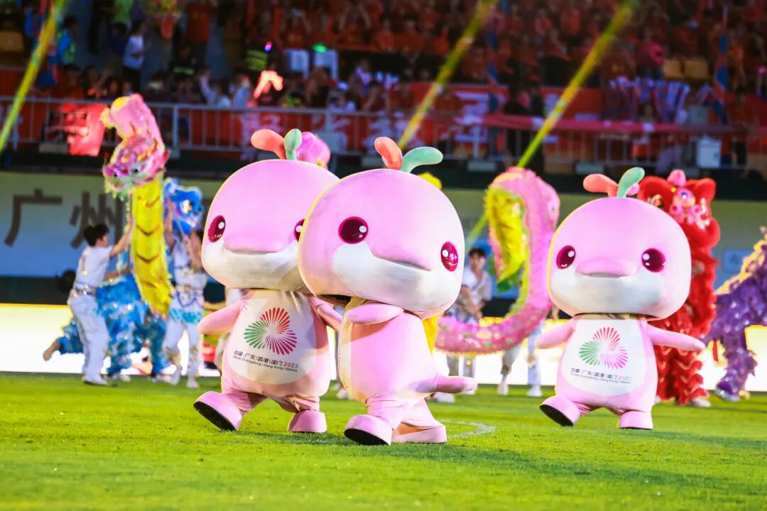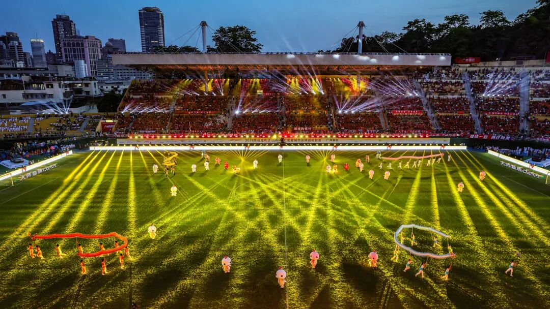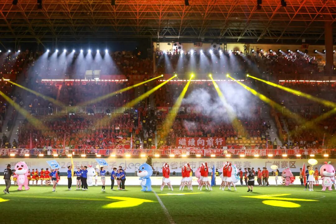 在开幕式的暖场环节,上演了一场舞龙、舞狮与“大湾鸡”集体表演——《一战城名·龙狮竞勇》。随即而来的是灯光秀《赛龙夺锦》、足球比赛阵型光影展示让现场观众球迷暂叹不已,全场更加是万人大合唱《海阔天空》。