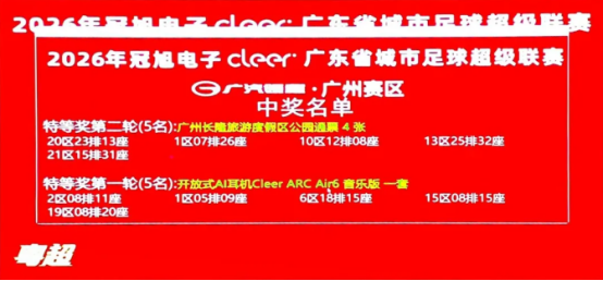 后续赛事将陆续在广东21 城 123 个赛场轮番上演,Cleer 价值 1399 元 ARC 6 耳机派送、「YES Cleer」手势狂欢、千元进球奖励计划、球迷专属福利同步跟进,下周关键对战赛程、全省完整对阵排期将持续更新发布。